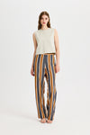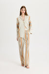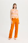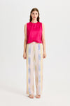 Brown Kutnu Trousers with Elastic Waistband and Tie Detail are made from 100% satin Kutnu fabric woven using the ikat technique. The back waistband is elasticated, providing a comfortable and flexible fit. They feature pocket details and are unlined. Their relaxed fit makes them an essential piece for everyday wear. Ideal for spring and summer, they pair easily with crop tops, blouses, vests, and/or jackets.