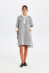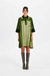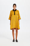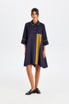 Kutnia’nın gelenekten ilham alarak modern tasarımla buluşturduğu lacivert polo yaka elbise, %100 kutnu kumaştan üretilmiştir. Yaka ve kol uçları kadife biye detaylarıyla zenginleştirilmiş olup, yarım kollu tasarımıyla zarif bir görünüm kazandırır. Astarsız yapısı hafiflik sağlarken, gömlek yakası ve önden patlı, dört düğmeli kapanışı klasik şıklığı öne çıkarır. Oval kesimli etek ucu ve arkası öne göre daha uzun tasarımı modern bir dinamizm katarken, rahat ve geniş formu konforlu bir kullanım sunar. Sonbahar-kış sezonuna uygun bu özel elbise, gündelik şehir şıklığından davetlere kadar her ortamda sofistike bir tarz yaratır.