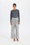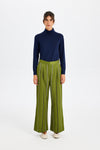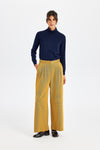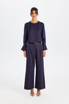 Kutnia’nın modern ve zamansız tasarım anlayışını yansıtan lacivert palazzo pantolon, %100 saten kutnu kumaştan üretilmiştir. Yüksek belli ve geniş kesimli formu, rahatlığı ve şıklığı bir araya getirirken, öndeki fermuarı ve yan cepleri işlevsellik sunar. Arkada sağ ve solda bulunan fonksiyonel olmayan fileto cepler tasarıma modern bir detay kazandırır. Bele oturan formu zarif bir siluet oluştururken, astarsız yapısı hafif bir kullanım sağlar. Sonbahar ve kış sezonuna uygun olan bu palazzo pantolon, şık bir bluz ya da triko takımıyla kombinlenerek sofistike bir görünüm yaratır.