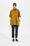 Kutnia’nın modern tasarım anlayışını yansıtan pelerin oversize kaban, %100 kutnu kumaştan üretilmiştir. İç kısmı ince kaşe kumaşla astarlanmış olup, sıcaklık ve konfor sağlar. Önden üç adet düğmeli formu klasik bir görünüm sunarken, yaka kısmındaki üç adet gold renkli kopça aksesuar tasarıma sofistike bir dokunuş katar. Sağ ve sol taraftaki ilik düğme detayları işlevsel bir görünüm kazandırır. Pelerin kol formu ve oversize kesimi sayesinde tüm bedenlere uyum sağlayan bu kaban, rahat ve modern bir stil sunar. Bluz, gömlek, pantolon veya etek takımlarıyla kolayca kombinlenerek sonbahar-kış mevsiminde hem şehir stilinde hem de davetlerde zamansız bir şıklık yaratır.