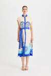 The Pink Curve Zeugma Sleeveless Silk Dress is a specially designed dress crafted from 100% silk fabric. It opens in the front with mother-of-pearl buttons and features slits on both sides. It features a shirt collar, off-the-shoulder hem, and is sleeveless. It features pockets and a portable sash. Its design was inspired by the works in the Gaziantep Zeugma Mosaic Museum.