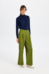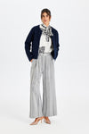 Kutnia’nın modern çizgisini geleneksel kutnu dokusuyla buluşturan palazzo pantolon, özel tasarım %100 kutnu kumaştan üretilmiştir. Yüksek belli ve geniş kesimli formu, zarif bir siluet sunarken konforlu bir kullanım sağlar. Öndeki fermuarı ve yan cepleri pratiklik katarken, arkada sağ ve solda yer alan fonksiyonel olmayan fileto cepler tasarıma modern bir detay ekler. Astarsız yapısı hafiflik sağlarken, bele oturan formu şıklığı ön plana çıkarır. Sonbahar ve kış sezonuna uygun olan bu palazzo pantolon, bluz veya triko takımlarıyla kombinlenerek hem günlük hem de davet şıklığında sofistike bir stil yaratır.