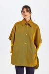 Kutnia’nın modern ve özgün yorumuyla tasarlanan pelerin oversize kaban, %100 kutnu kumaştan üretilmiştir. İç kısmı ince kaşe kumaşla astarlanarak hem konfor hem de sıcaklık sağlar. Önden üç adet düğme ile kapanan tasarımı klasik bir şıklık sunarken, yaka kısmında yer alan üç adet gold renkli kopça aksesuar sofistike bir dokunuş ekler. Sağ ve sol taraftaki ilik düğme detayları ve pelerin kol formu tasarımı zenginleştirir. Standart beden kesimiyle tüm vücut tiplerine uyum sağlayan bu kaban, geniş ve rahat formuyla öne çıkar. Sonbahar-kış sezonuna uygun olan bu özel tasarım, bluz, gömlek, pantolon veya etek takımlarıyla kombinlenerek hem günlük şehir stilinde hem de davetlerde zamansız bir şıklık yaratır.