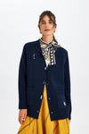 Kutnia’nın zarif detaylarla modern konforu buluşturduğu taş işlemeli lacivert triko ceket, %100 doğal ve sürdürülebilir yün iplikten üretilmiştir. Çelik örgü yapısı dayanıklılık ve uzun ömür sağlarken, rahat kesimiyle konforlu bir kullanım sunar. Uzun kollu ve v yaka formu modern bir görünüm kazandırırken, sağ ön yakada ve ön pat üzerinde yer alan taş işlemeleri tasarıma sofistike bir ışıltı katar. Önden çıtçıtlı kapanışı pratiklik sağlarken, reglan kol detayı hareket özgürlüğünü artırır. Sonbaharın ferah günlerinden kışın katmanlı kombinlerine kadar her mevsime uyum sağlayan bu çok yönlü parça; bluz, gömlek, etek veya pantolon takımlarıyla kombinlenerek gardırobun vazgeçilmezlerinden biri olmaya adaydır.
